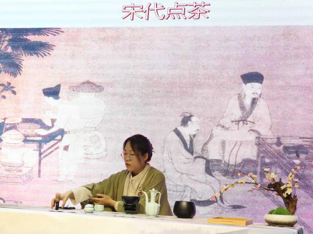 随后的点茶演示将活动推向新的高潮。金绮芳博士执筅献艺,手法沉稳从容。茶筅在盏中匀速击拂,乳白的沫饽渐次浮现,如堆云积雪,呈现出宋人典籍中记载的"白如积雪,稠密绵韧"的完美形态。随着汤花凝结成持久不散的云朵状,宋代点茶技艺中最具代表性的"咬盏"境界得以完美再现。这一古法技艺的生动还原,将千年前的文人雅趣呈现于当代舞台,令在场观众沉浸其中,赞叹不已。最后,师生共同移步至茶史博物展区开展实践教学。在金绮芳博士的讲解引导下,同学们沿着历史脉络系统观摩了茶叶从发现利用到文化传承的发展历程,通过实物展陈与文献资料深化了对茶文化演进轨迹的认知理解。