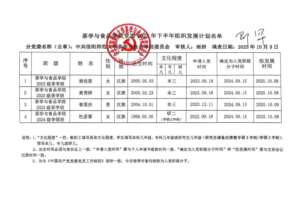 根据《中国共产党发展党员工作细则》(中办发[2014]33号)、《信阳师范学院发展党员工作实施细则》(信院组发[2018]19号)等文件要求,经资格审查(根据本人上报成绩,结合教务系统导出成绩排名和班级提供的综合测评情况)、民主评议、党委研究讨论,拟确定谢佳茵、黄秀婷、普国庆、杜彦蓉,4人为我们2025年下半年党员发展对象,现将名单予以公示,公示期为6天。